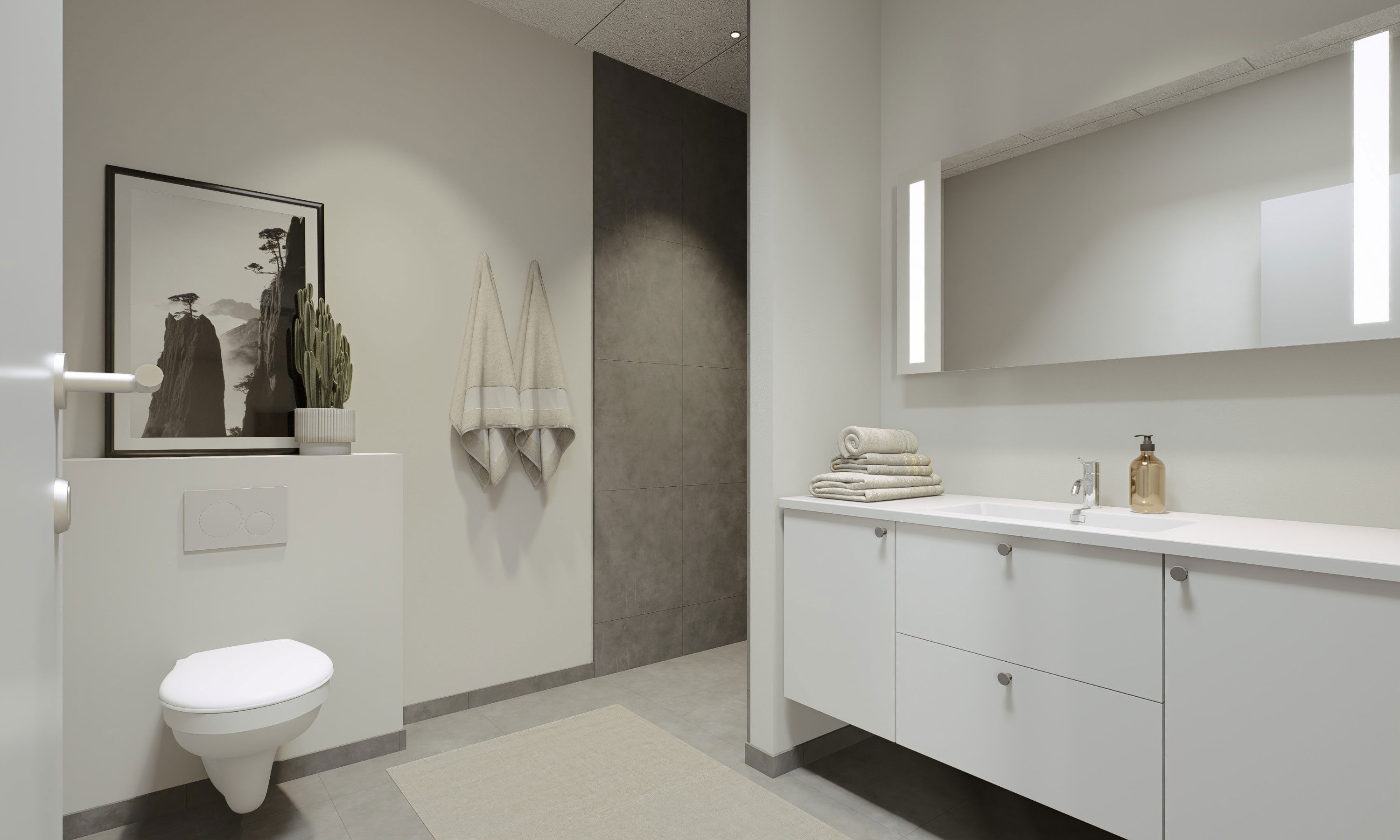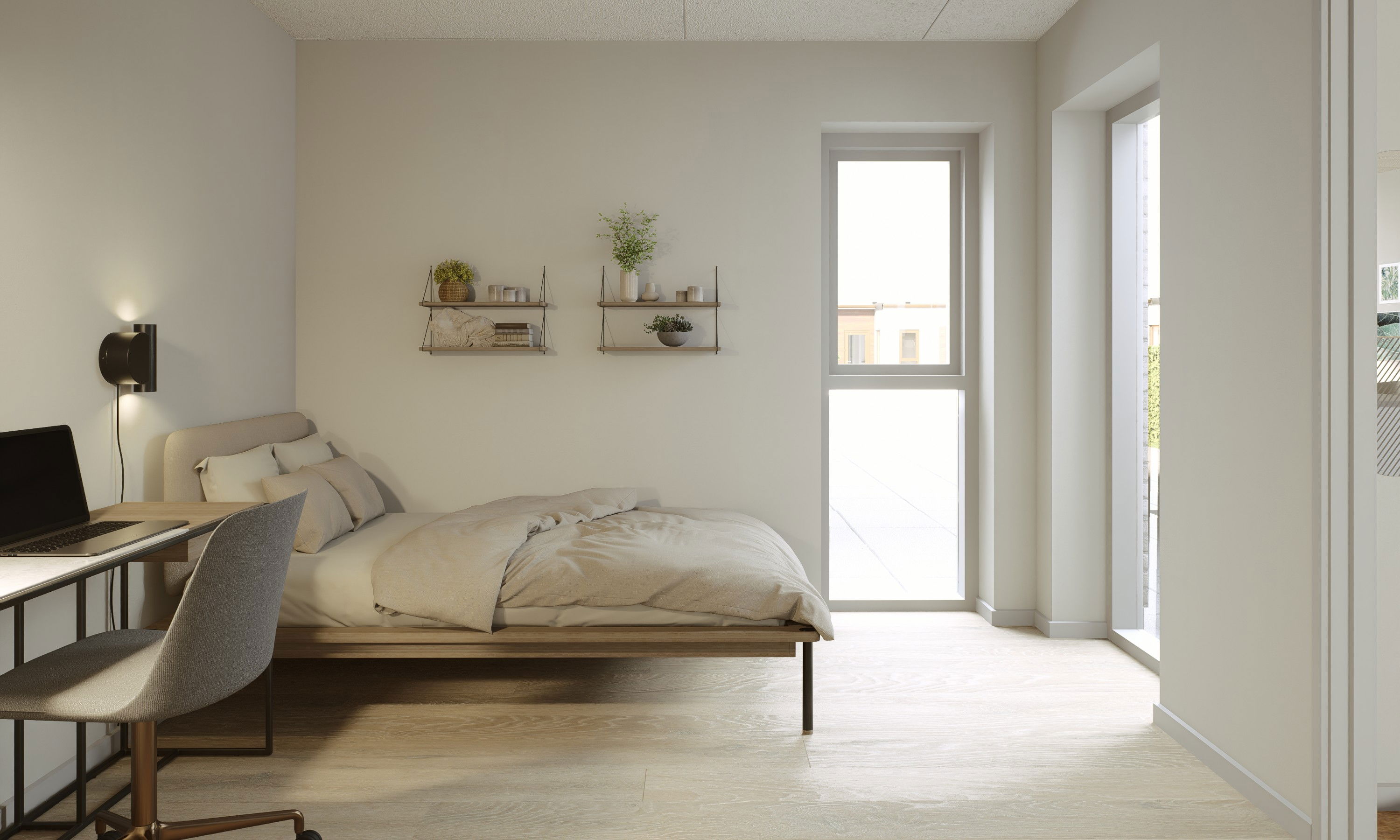 Vores fire-værelses rækkehus på 113 m² er indrettet til en hverdag, der glider let – hvor du og familien kan være sammen i det store fællesrum, og samtidig have mulighed for at trække jer, når der er brug for ro. Husets naturlige samlingspunkt er køkken/alrummet på 47,3 m², som giver en helt særlig rummelighed i hverdagen: her kan madlavning, gæster, avisen på bordet, lektier, leg og de stille stunder i sofaen leve side om side, hvor der er plads til at være sammen og have plads omkring jer. Rummet inviterer til en bevidst indretning, hvor stuen tænkes ind som en del af helheden, så I får ét stort hjerterum, der samler familien – og gør det nemt at følge hinanden gennem dagen, uanset om nogen står ved køkkenøen, andre sidder ved spisebordet, eller børnene leger i nærheden. Samtidig er planløsningen skabt, så I får mulighed for at trække jer, når der er brug for det: de ekstra værelser kan fungere som børneværelser, men lige så naturligt som kontor, hobbyrum eller et gæsteværelse til dem, der kommer forbi i weekenden – eller til børn og børnebørn, der gerne vil blive lidt længere. Badeværelset ligger centralt placeret tæt ved værelserne, så det er nemt at nå fra hele huset, og det gør især morgener og hverdagsrytmer mere ukomplicerede. Allerede når I træder ind, mærker I også den gennemtænkte hverdagsluksus i entré/bryggers: her er der tre skabe og en vask, og teknikken er gemt pænt af vejen bag skydedøre, så rummet føles roligt og ryddeligt, selv når livet er i fuld gang. På den ene side er der plads til knagerække og bænk, så sko og overtøj får sin naturlige plads, og ved siden af skabene kan I hænge et spejl og måske have hundekurven, hvis I har en firbenet ven med i familien. For hos os er kæledyr nemlig velkomne. Det hele er tænkt, så hjemmet hjælper jer med at holde overblik og skabe flow – med plads til både nærvær, privatliv og de små hverdagsrutiner, der gør, at man hurtigt begynder at føle sig hjemme.