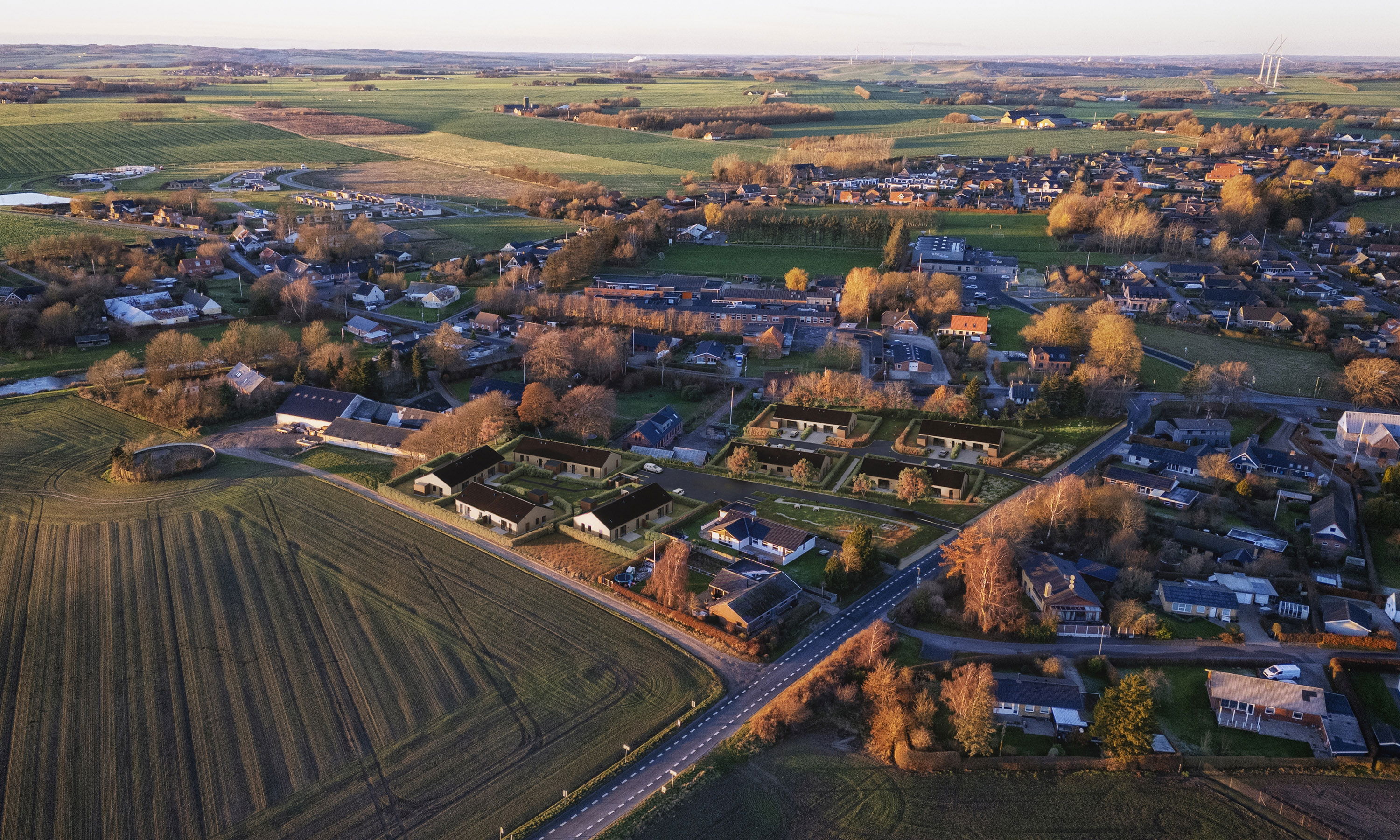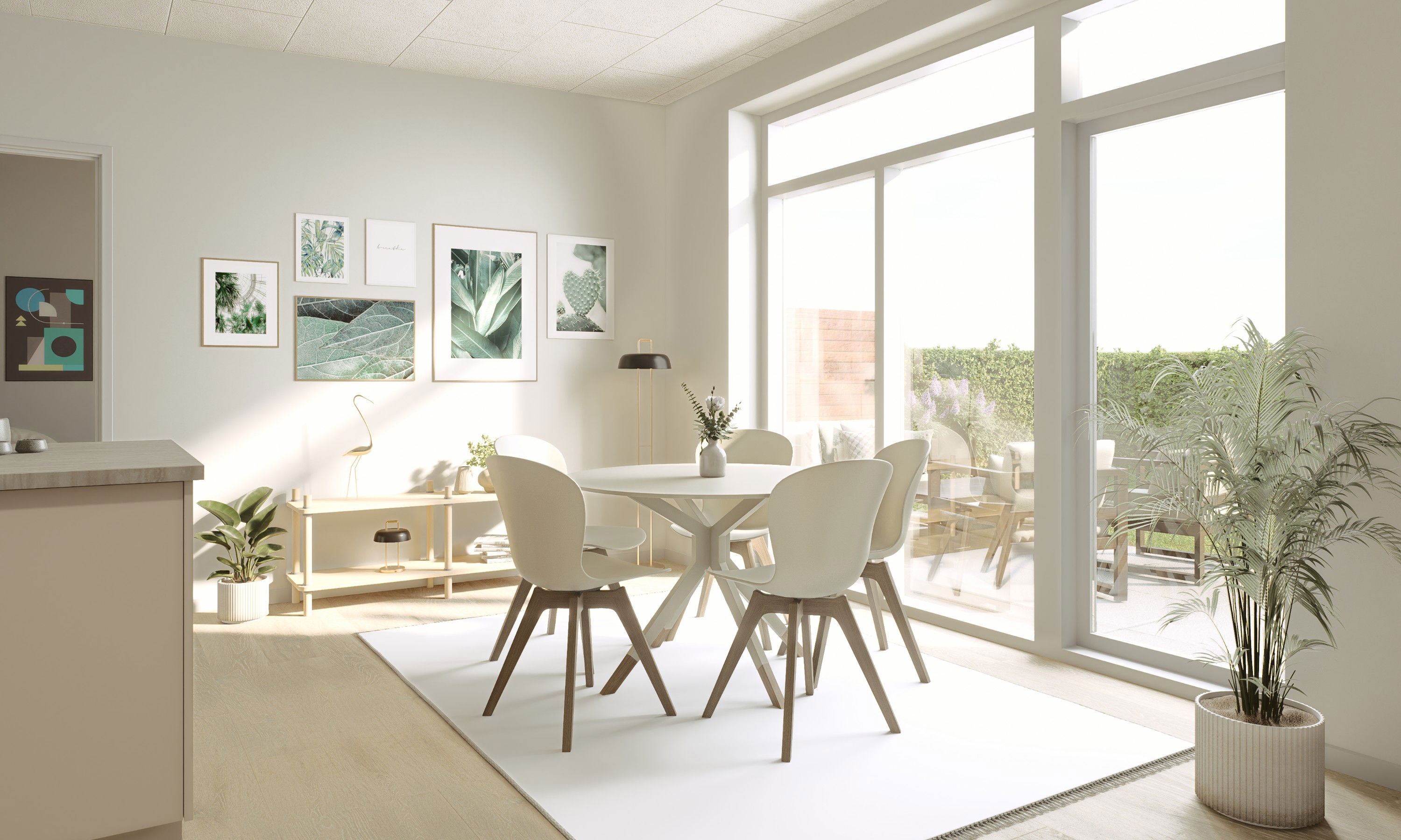 Vores fire-værelses rækkehus på 113 m² er indrettet til en hverdag, der glider let – hvor du og familien kan være sammen i det store fællesrum, og samtidig have mulighed for at trække jer, når der er brug for ro. Husets naturlige samlingspunkt er køkken/alrummet på 47,3 m², som giver en helt særlig rummelighed i hverdagen: her kan madlavning, gæster, avisen på bordet, lektier, leg og de stille stunder i sofaen leve side om side, hvor der er plads til at være sammen og have plads omkring jer. Rummet inviterer til en bevidst indretning, hvor stuen tænkes ind som en del af helheden, så I får ét stort hjerterum, der samler familien – og gør det nemt at følge hinanden gennem dagen, uanset om nogen står ved køkkenøen, andre sidder ved spisebordet, eller børnene leger i nærheden. Samtidig er planløsningen skabt, så I får mulighed for at trække jer, når der er brug for det: de ekstra værelser kan fungere som børneværelser, men lige så naturligt som kontor, hobbyrum eller et gæsteværelse til dem, der kommer forbi i weekenden – eller til børn og børnebørn, der gerne vil blive lidt længere. Badeværelset ligger centralt placeret tæt ved værelserne, så det er nemt at nå fra hele huset, og det gør især morgener og hverdagsrytmer mere ukomplicerede. Allerede når I træder ind, mærker I også den gennemtænkte hverdagsluksus i entré/bryggers: her er der tre skabe og en vask, og teknikken er gemt pænt af vejen bag skydedøre, så rummet føles roligt og ryddeligt, selv når livet er i fuld gang. På den ene side er der plads til knagerække og bænk, så sko og overtøj får sin naturlige plads, og ved siden af skabene kan I hænge et spejl og måske have hundekurven, hvis I har en firbenet ven med i familien. For hos os er kæledyr nemlig velkomne. Det hele er tænkt, så hjemmet hjælper jer med at holde overblik og skabe flow – med plads til både nærvær, privatliv og de små hverdagsrutiner, der gør, at man hurtigt begynder at føle sig hjemme.