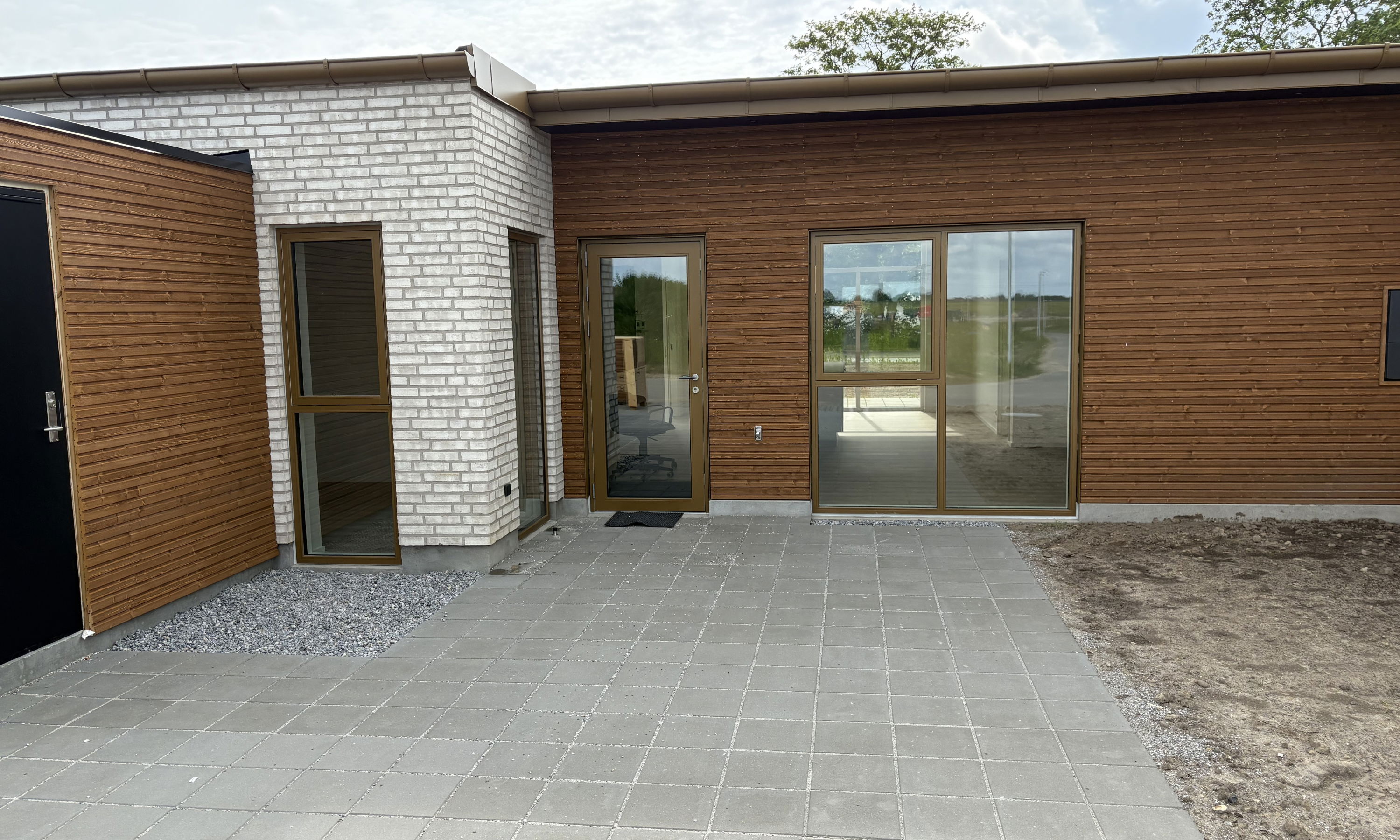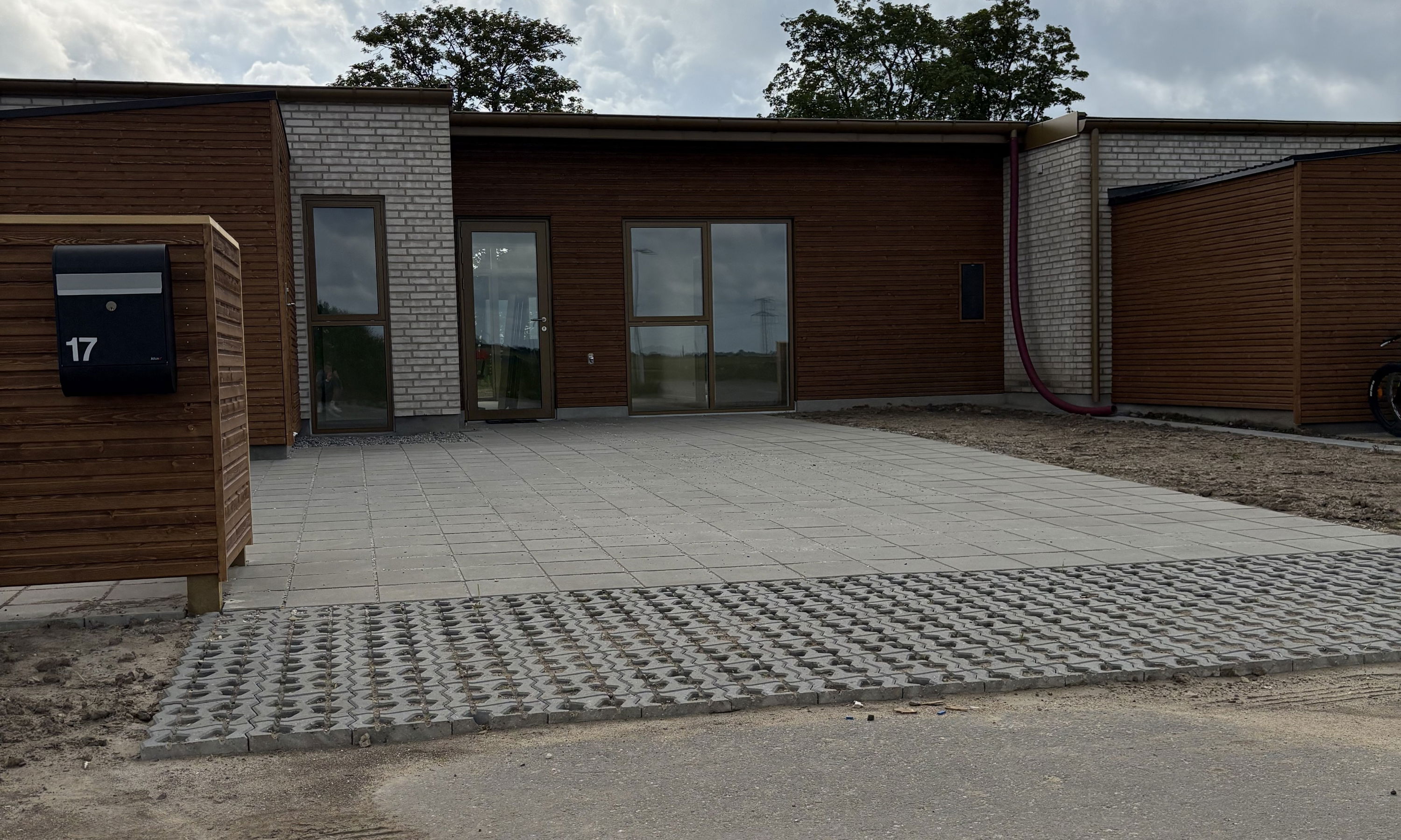 Boligen har flisebelagt terrasser både foran og bag huset således du kan nyde solen både morgen og aften samt tilhørende have, hæk og skur hvor der er klargjort til Elbil.