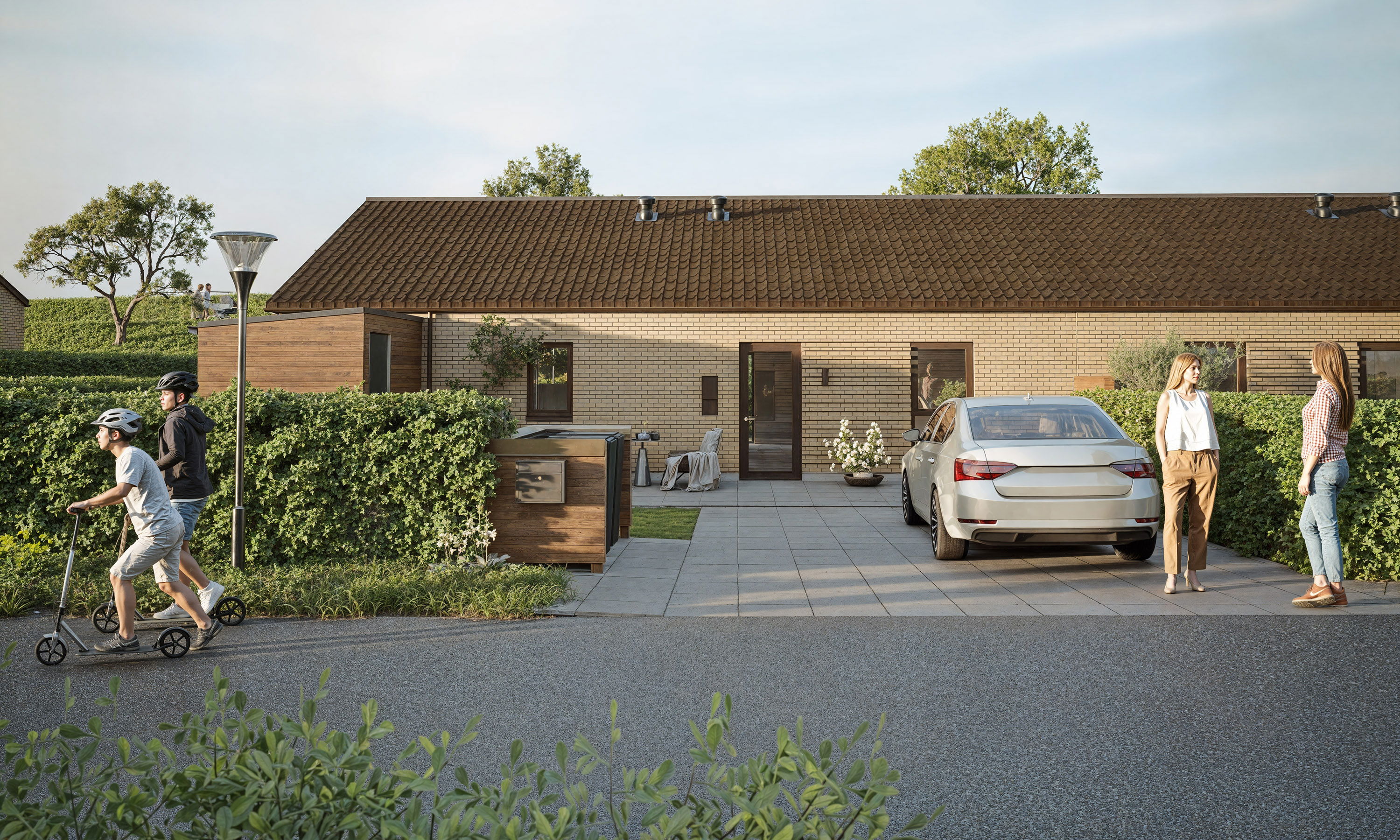 Vores fire-værelses rækkehus på 113 m² er indrettet til en hverdag, der glider let – hvor du og familien kan være sammen i det store fællesrum, og samtidig have mulighed for at trække jer, når der er brug for ro. Husets naturlige samlingspunkt er køkken/alrummet på 47,3 m², som giver en helt særlig rummelighed i hverdagen: her kan madlavning, gæster, avisen på bordet, lektier, leg og de stille stunder i sofaen leve side om side, hvor der er plads til at være sammen og have plads omkring jer. Rummet inviterer til en bevidst indretning, hvor stuen tænkes ind som en del af helheden, så I får ét stort hjerterum, der samler familien – og gør det nemt at følge hinanden gennem dagen, uanset om nogen står ved køkkenøen, andre sidder ved spisebordet, eller børnene leger i nærheden. Samtidig er planløsningen skabt, så I får mulighed for at trække jer, når der er brug for det: de ekstra værelser kan fungere som børneværelser, men lige så naturligt som kontor, hobbyrum eller et gæsteværelse til dem, der kommer forbi i weekenden – eller til børn og børnebørn, der gerne vil blive lidt længere. Badeværelset ligger centralt placeret tæt ved værelserne, så det er nemt at nå fra hele huset, og det gør især morgener og hverdagsrytmer mere ukomplicerede. Allerede når I træder ind, mærker I også den gennemtænkte hverdagsluksus i entré/bryggers: her er der tre skabe og en vask, og teknikken er gemt pænt af vejen bag skydedøre, så rummet føles roligt og ryddeligt, selv når livet er i fuld gang. På den ene side er der plads til knagerække og bænk, så sko og overtøj får sin naturlige plads, og ved siden af skabene kan I hænge et spejl og måske have hundekurven, hvis I har en firbenet ven med i familien. For hos os er kæledyr nemlig velkomne. Det hele er tænkt, så hjemmet hjælper jer med at holde overblik og skabe flow – med plads til både nærvær, privatliv og de små hverdagsrutiner, der gør, at man hurtigt begynder at føle sig hjemme.